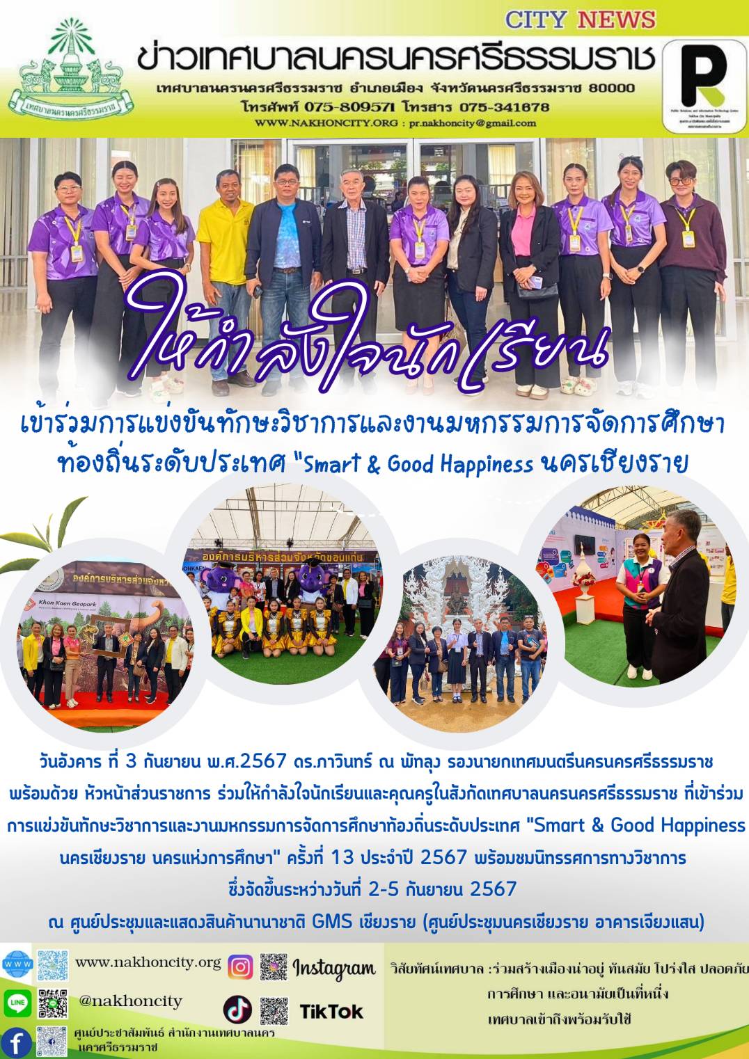 วันอังคาร ที่ 3 กันยายน พ.ศ.2567 ดร.ภาวินทร์ ณ พัทลุง รองนายกเทศมนตรีนครนครศรีธรรมราช พร้อมด้วย หัวหน้าส่วนราชการ ร่วมให้กำลังใจนักเรียนและคุณครูในสังกัดเทศบาลนครนครศรีธรรมราช ที่เข้าร่วมการแข่งขันทักษะวิชาการและงานมหกรรมการจัดการศึกษาท้องถิ่นระดับประเทศ "Smart & Good Happiness นครเชียงราย นครแห่งการศึกษา" ครั้งที่ 13 ประจำปี 2567 พร้อมชมนิทรรศการทางวิชาการ ซึ่งจัดขึ้นระหว่างวันที่ 2-5 กันยายน 2567 ณ ศูนย์ประชุมและแสดงสินค้านานาชาติ GMS เชียงราย (ศูนย์ประชุมนครเชียงราย อาคารเจียงแสน) |