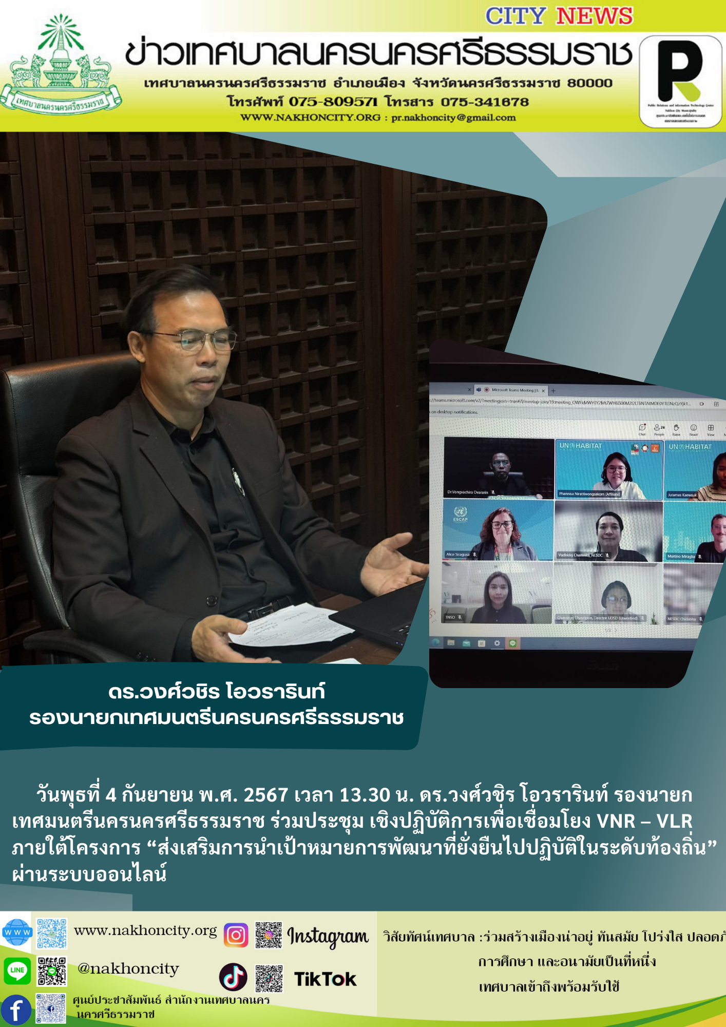 วันพุธที่ 4 กันยายน พ.ศ. 2567 เวลา 13.30 น. ดร.วงศ์วชิร โอวรารินท์ รองนายกเทศมนตรีนครนครศรีธรรมราช ร่วมประชุม เชิงปฏิบัติการเพื่อเชื่อมโยง VNR – VLR ภายใต้โครงการ “ส่งเสริมการนำเป้าหมายการพัฒนาที่ยั่งยืนไปปฏิบัติในระดับท้องถิ่น” ผ่านระบบออนไลน์