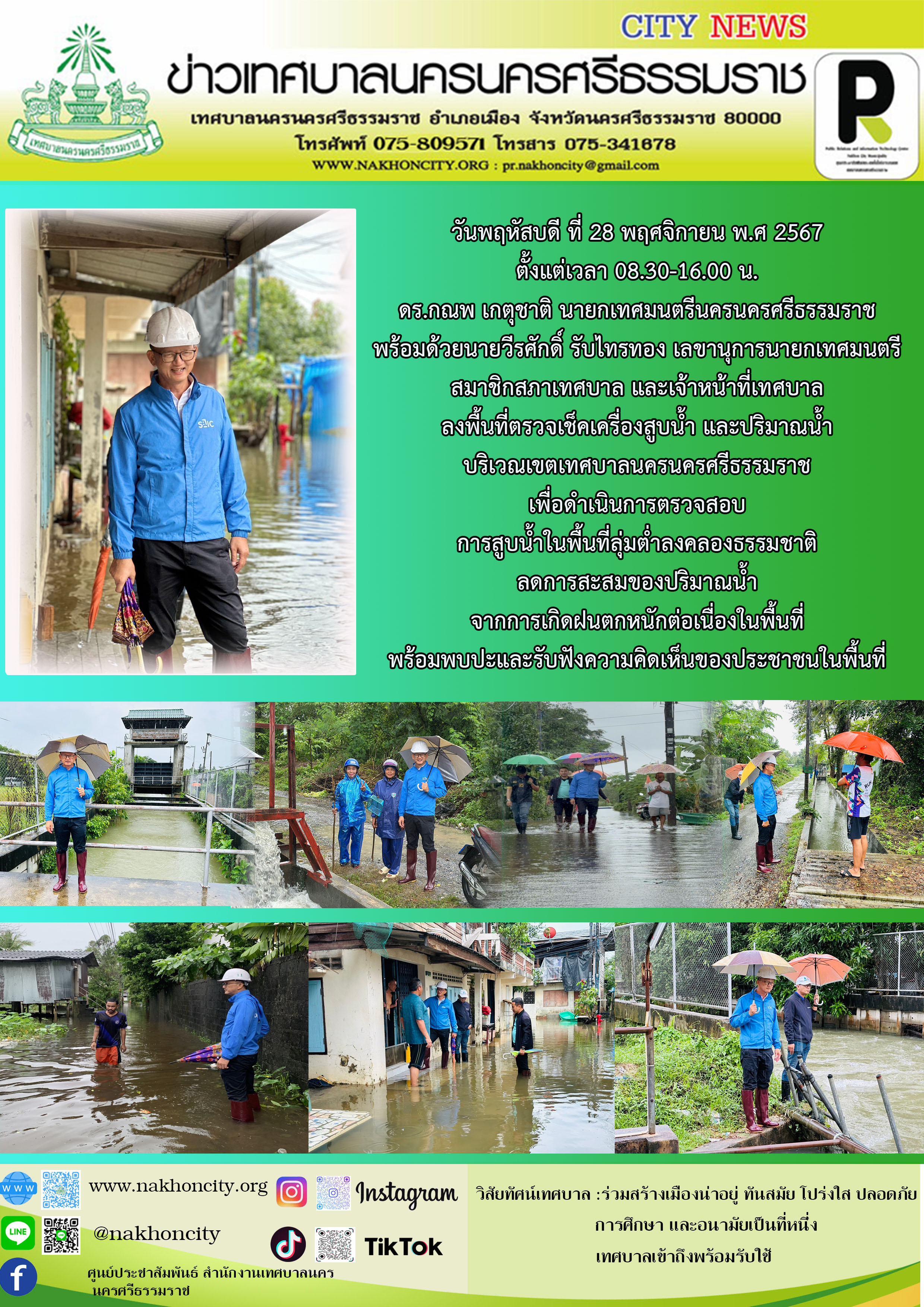 นายกเทศมนตรีนครนครศรีธรรมราช พร้อมด้วย เลขานุการนายกเทศมนตรี สมาชิกสภาเทศบาล และเจ้าหน้าที่เทศบาล ลงพื้นที่ตรวจเช็คเครื่องสูบน้ำ และปริมาณน้ำ บริเวณเขตเทศบาลนครนครศรีธรรมราช |
