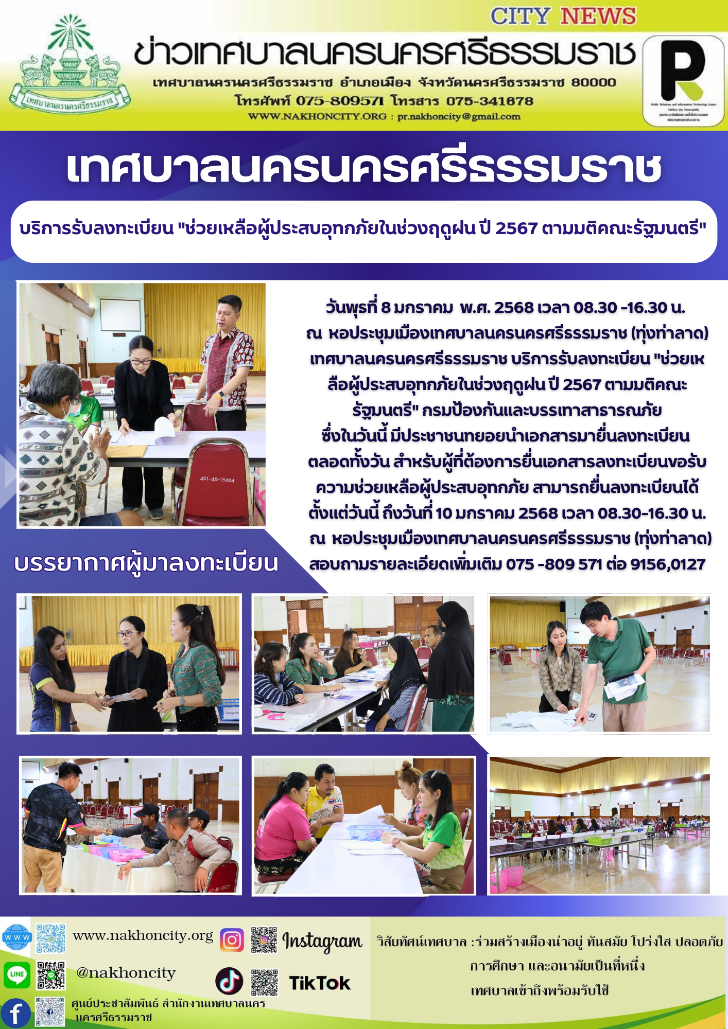 วันพุธที่ 8 มกราคม พ.ศ. 2568 เวลา 08.30 -16.30 น. ณ หอประชุมเมืองเทศบาลนครนครศรีธรรมราช (ทุ่งท่าลาด) เทศบาลนครนครศรีธรรมราช บริการรับลงทะเบียน "ช่วยเหลือผู้ประสบอุทกภัยในช่วงฤดูฝน ปี 2567 ตามมติคณะรัฐมนตรี" กรมป้องกันและบรรเทาสาธารณภัย