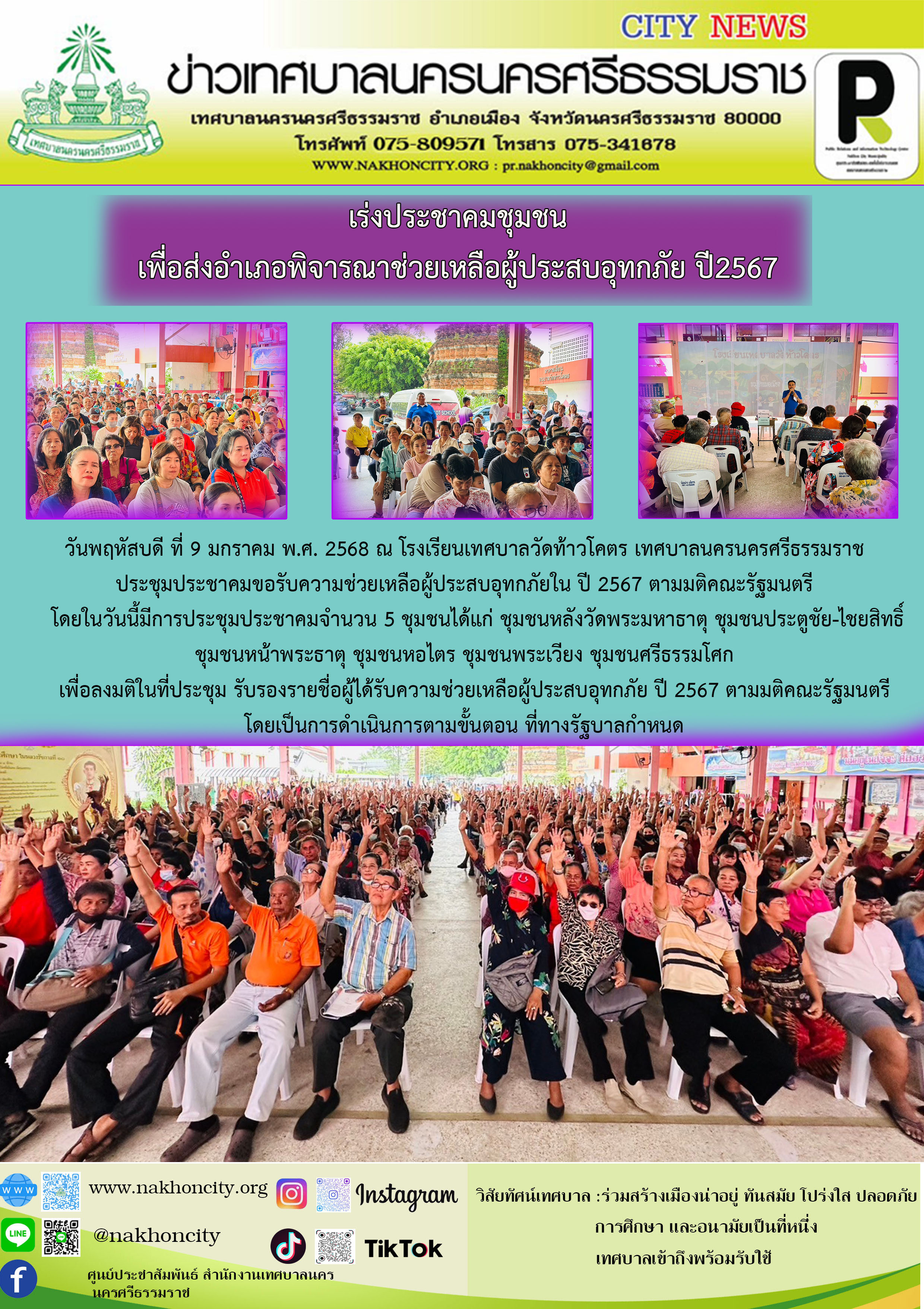 วันพฤหัสบดี ที่ 9 มกราคม พ.ศ. 2568 ณ โรงเรียนเทศบาลวัดท้าวโคตร เทศบาลนครนครศรีธรรมราช ประชุมประชาคมขอรับความช่วยเหลือผู้ประสบอุทกภัยใน ปี 2567 ตามมติคณะรัฐมนตรี