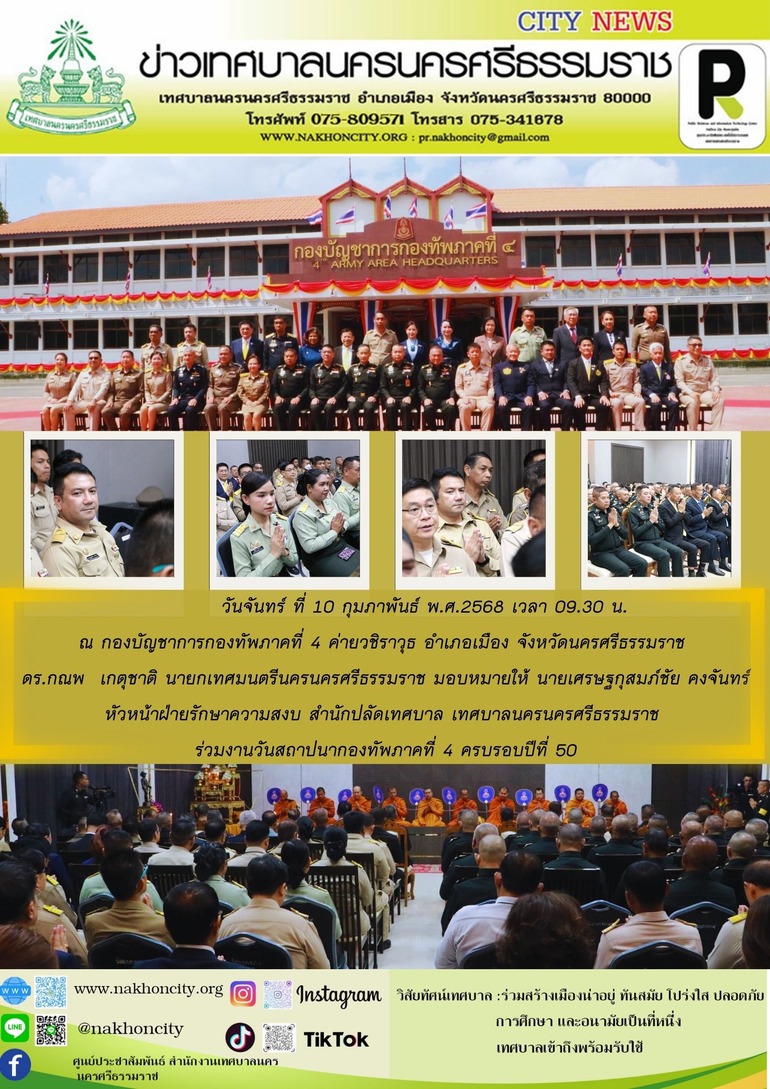นายกเทศมนตรีนครนครศรีธรรมราช มอบหมายให้ นายเศรษฐกุสมภ์ชัย คงจันทร์ หัวหน้าฝ่ายรักษาความสงบ สำนักปลัดเทศบาล เทศบาลนครนครศรีธรรมราช ร่วมงานวันสถาปนากองทัพภาคที่ 4 ครบรอบปีที่ 50 |
