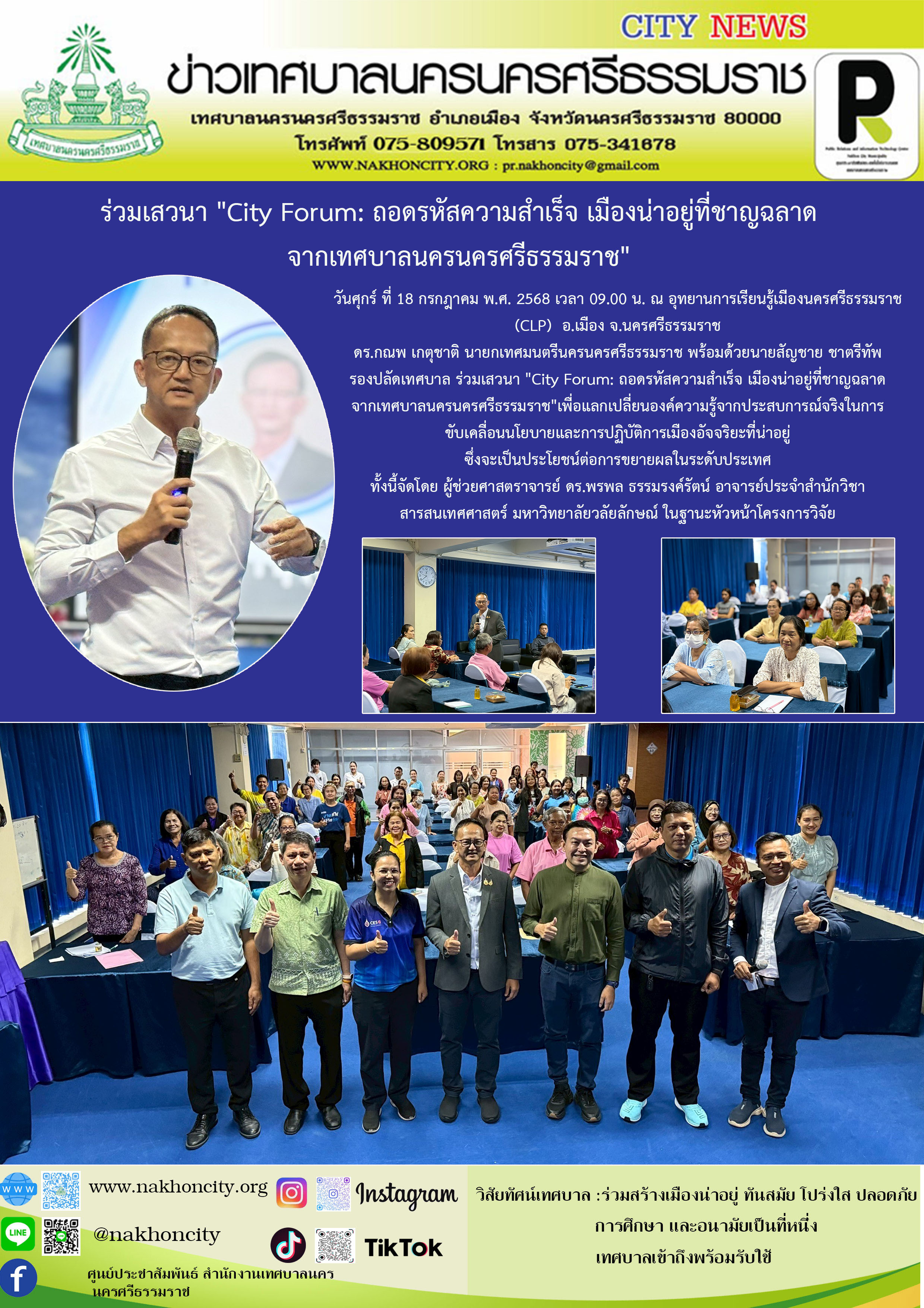 | นายกเทศมนตรีนครนครศรีธรรมราช พร้อมด้วย รองปลัดเทศบาล ร่วมเสวนา "City Forum: ถอดรหัสความสำเร็จ เมืองน่าอยู่ที่ชาญฉลาด จากเทศบาลนครนครศรีธรรมราช" |