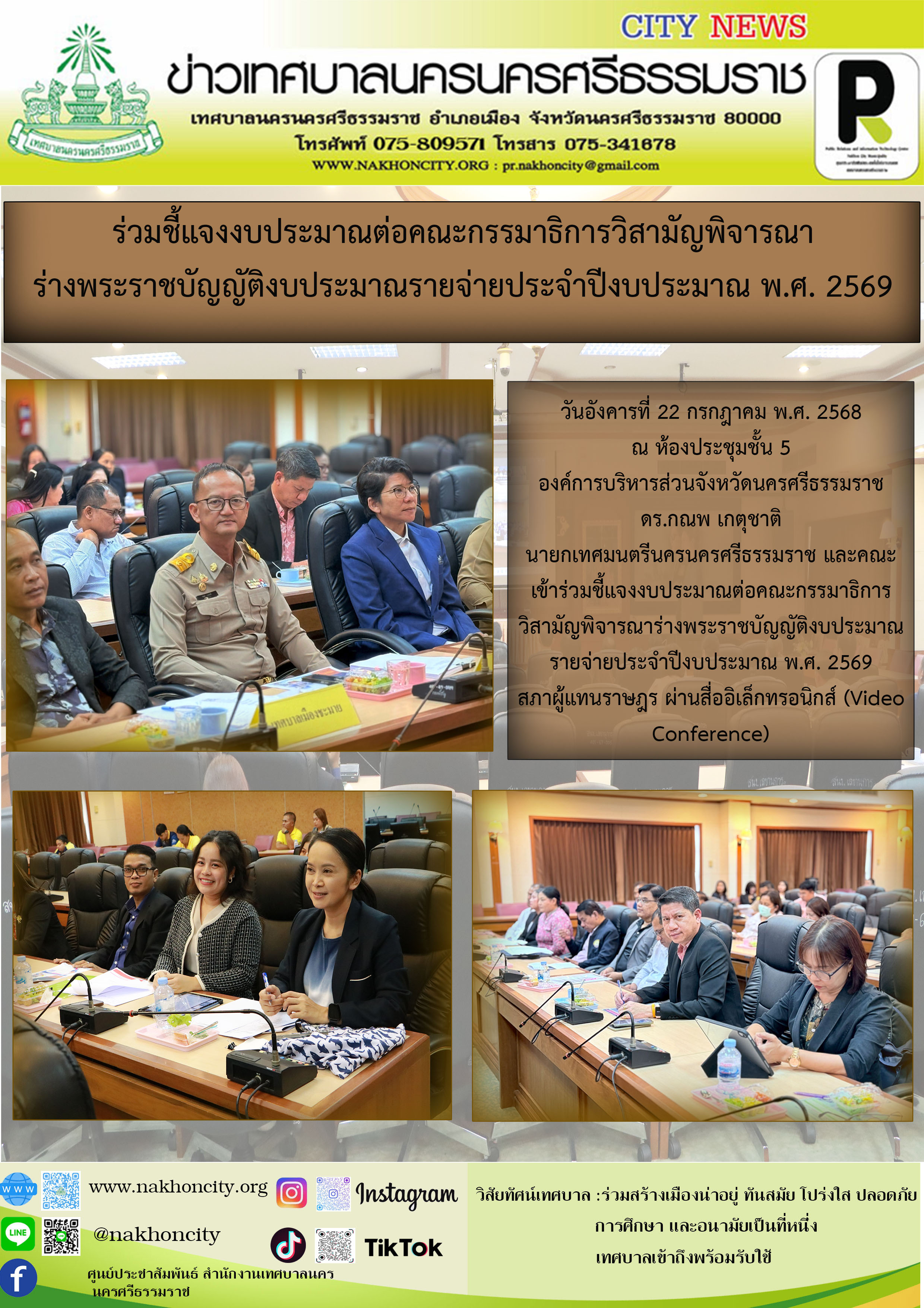 นายกเทศมนตรีนครนครศรีธรรมราช และคณะ เข้าร่วมชี้แจงงบประมาณต่อคณะกรรมาธิการวิสามัญพิจารณาร่างพระราชบัญญัติงบประมาณรายจ่ายประจำปีงบประมาณ พ.ศ. 2569 สภาผู้แทนราษฎร ผ่านสื่ออิเล็กทรอนิกส์ (Video Conference) |