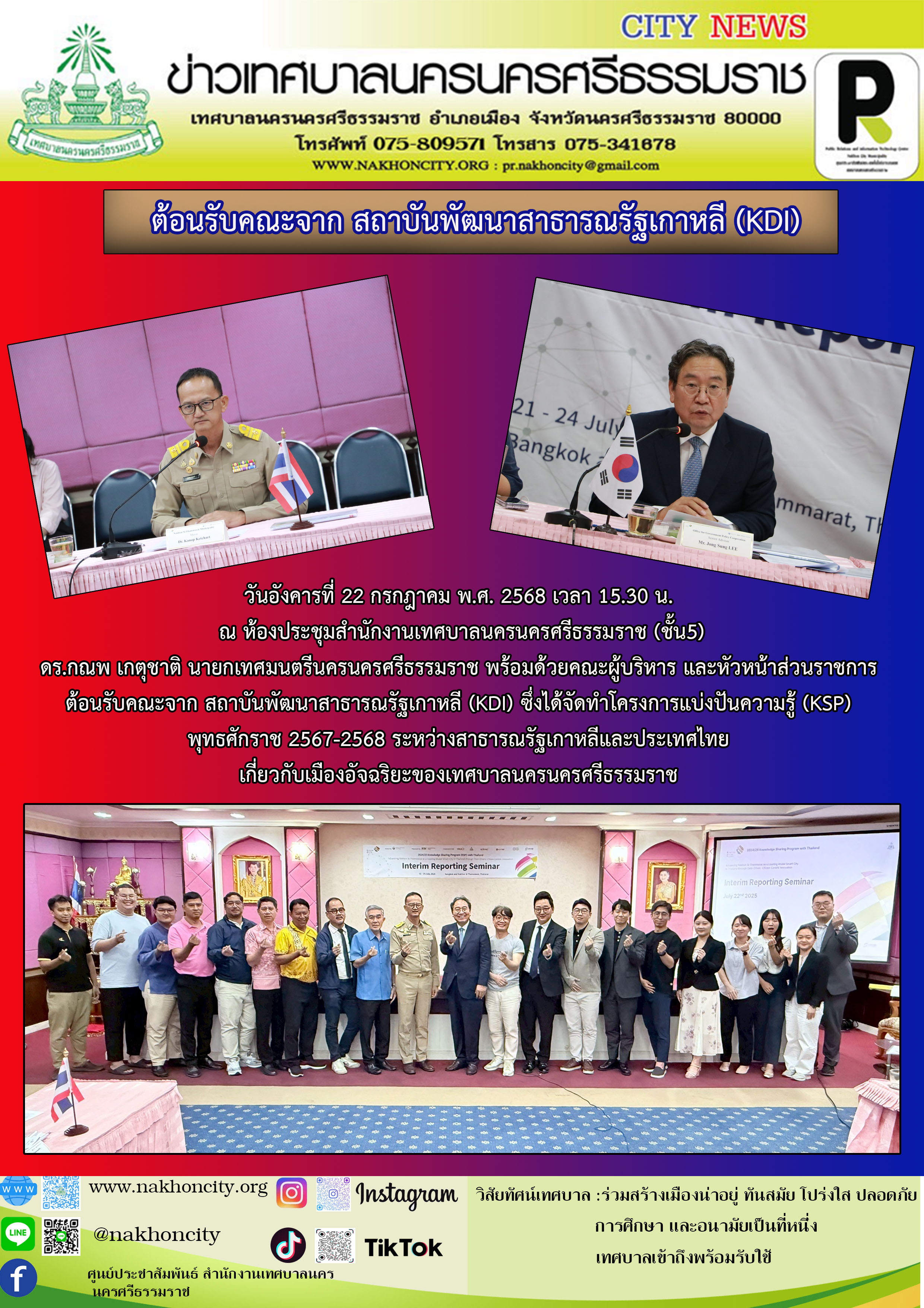 นายกเทศมนตรีนครนครศรีธรรมราช พร้อมด้วยคณะผู้บริหาร และหัวหน้าส่วนราชการ ต้อนรับคณะจาก สถาบันพัฒนาสาธารณรัฐเกาหลี (KDI) |
