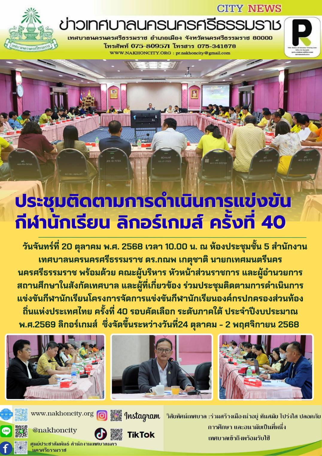 วันจันทร์ที่ 20 ตุลาคม พ.ศ. 2568 เวลา 10.00 น. ณ ห้องประชุมชั้น 5 สำนักงานเทศบาลนครนครศรีธรรมราช ดร.กณพ เกตุชาติ นายกเทศมนตรีนครนครศรีธรรมราช พร้อมด้วย คณะผู้บริหาร หัวหน้าส่วนราชการ และผู้อำนวยการสถานศึกษาในสังกัดเทศบาล และผู้ที่เกี่ยวข้อง ร่วมประชุมติดตามการดำเนินการแข่งขันกีฬานักเรียนโครงการจัดการแข่งขันกีฬานักเรียนองค์กรปกครองส่วนท้องถิ่นแห่งประเทศไทย ครั้งที่ 40 รอบคัดเลือก ระดับภาคใต้ ประจำปีงบประมาณ พ.ศ.2569 ลิกอร์เกมส์ ซึ่งจัดขึ้นระหว่างวันที่24 ตุลาคม - 2 พฤศจิกายน 2568 |