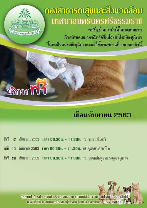 เทศบาลนครนครศรีธรรมราช ภายใต้การนำ ผศ.เชาวน์วัศ เสนพงศ์ นายกเทศมนตรีนครนครศรีธรรมราช โดยกองสาธารณสุขและสิ่งแวดล้อม กำหนดออกหน่วยจัดทำทะเบียนประวัติสุนัขและแมว ฉีดวัคซีนป้องกันโรคพิษสุนัขบ้า ประจำเดือน กันยายน 2563 ดังนี้